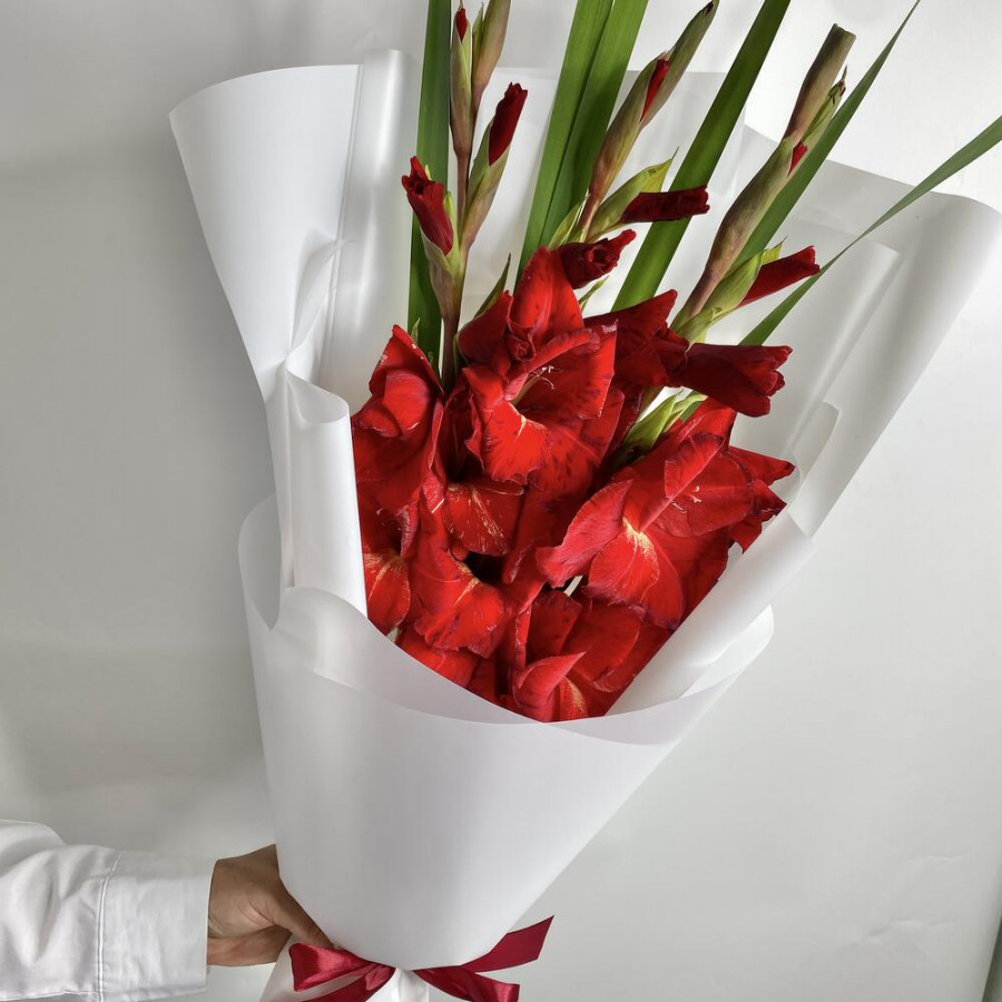 На фото букет из 3 красных гладиолусов. В составе: гладиолус 3 шт, дизайнерская упаковка 2 шт, атласная лента 2 шт, . Все цветы свежие и ароматные, букет красиво оформлен и отлично подходит для подарка. Доступна доставка цветов или самовывоз.