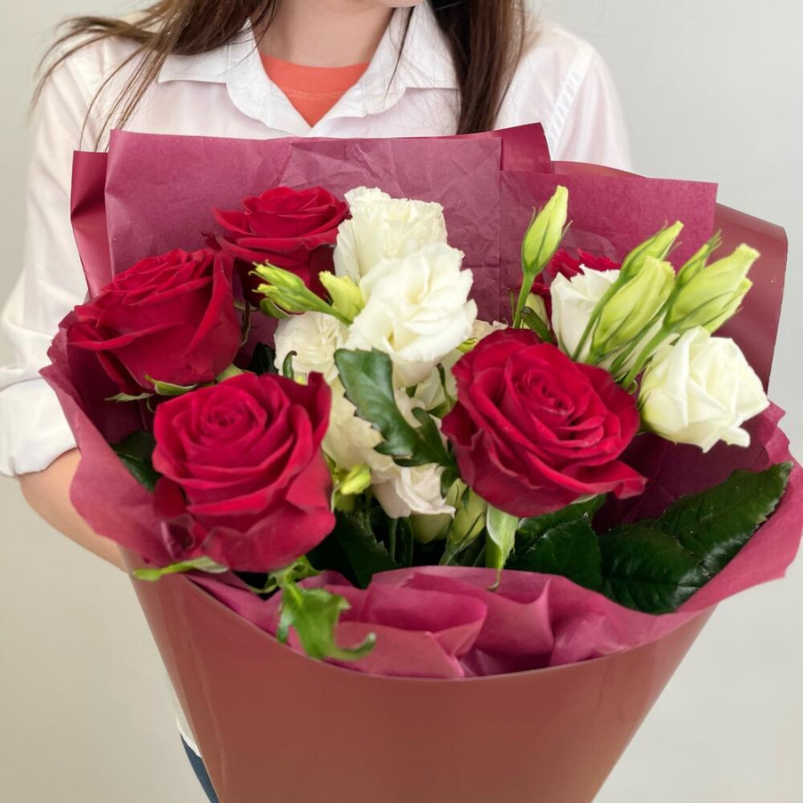 На фото букет «гранатовый сад». В составе: роза 5 шт, эустома (лизиантус) 3 шт, дизайнерская упаковка 2 шт, атласная лента 1 шт, . Все цветы свежие и ароматные, букет красиво оформлен и отлично подходит для подарка. Доступна доставка цветов или самовывоз.